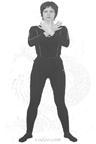 Из исходного положения прыжком принимаете позу всадника (с широко расставленными полусогнутыми ногами), туловище слегка наклоняете вперед, спина остается ровной. Ладони положите на колени так, чтобы большие пальцы находились на боковых поверхностях ног, остальные - на внутренних, локти выдвинуты вперед. Делая глубокий медленный вдох, описываете головой дугу в 180 градусов из верхнего положения через правую сторону вниз. При этом напрягаете левое плечо и шею, будто на них находится невидимый груз. Через шесть секунд голова оказывается в нижнем положении, туловище при этом наклонено горизонтально. Затем описываете дугу в обратном направлении, вверх. Находясь в крайнем нижнем положении поклона, делаете паузу, пальцы от коленей не отрываете. Затем медленно поднимаете корпус, как бы преодолевая невидимую преграду. Когда туловище оказывается в верхнем положении, максимально отклоняете голову вверх и назад. Делая выдох, расслабляетесь и очень медленно возвращаете голову в естественное положение. Вращение тела, многократные повороты и поднятия головы при наклонном положении туловища пробивают блоки в шее и пропускают энергию в мозг.